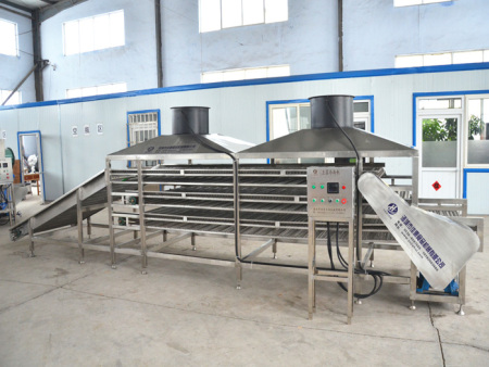 把已鹵煮、油炸過的物料(豆干、油炸食品)倒入振動篩上,通過振動篩的振動,自動分散攤開,然后自動進入攤涼機,攤涼機有強流風冷風機,可以給物料進行強制降溫,攤涼機具有自動翻轉的功能,可以把豆干的兩面進行風吹除水、降溫,直至物料冷卻降溫。