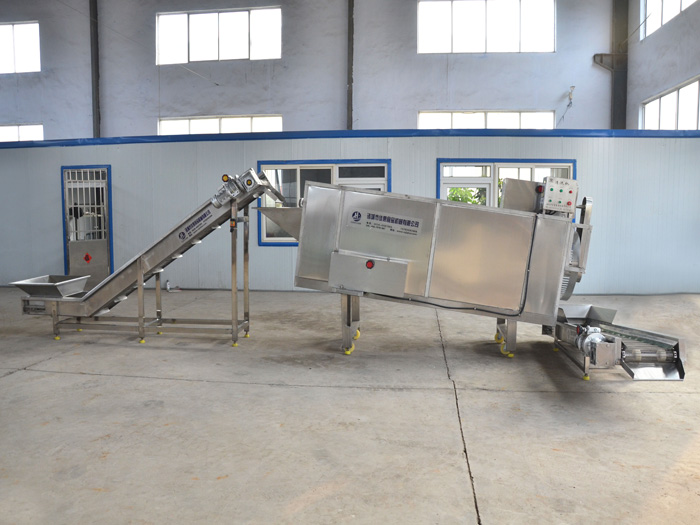 滾筒清洗機是利用旋轉的滾筒帶動物料拋起到高度落下,然后中間反向旋轉的毛輥不斷反復刷洗粘附在物料表面上及縫隙中的泥沙,并在高壓水噴淋沖洗下,清洗物料,污物從滾筒下端流出。整個清洗機進料端高,出料端低,方便出料。