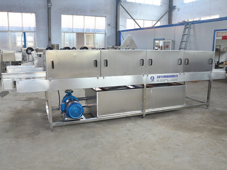 3、設備出料提升段帶有噴淋裝置,在清洗結束后輸送至下道工序過程中,對產品進行噴淋,減少二次污染.